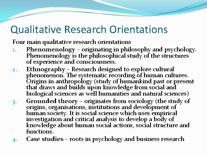 Name and briefly describe the four qualitative research orientations. Individuals develop worldviews based on their discipline orientations and research communities advisors and mentors and past research experiences. It is one of the most popular and widely used techniques of.